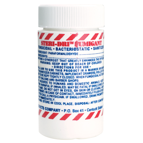 Noble pine steri-dri™ fumigant is a fungicidal bacteriostatic sanitizer. leave an open container of steri-dri™ in a closed drawer for 24 hours with your implements. lasts about six months. not sold in ca. 1/2 oz.